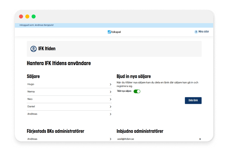As part of Folkspel's web platform, we have been involved in developing the sales tool used by associations and organizations to manage their teams/groups and users.