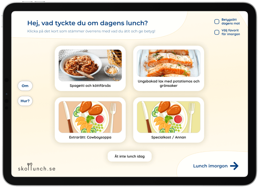 Through a user-friendly interface, students can rate and comment on the food they have eaten at school. The focus has been on making it fun to participate and giving students the feeling that they can actually influence the food that is served. Students can also tick the box for the dish they prefer to eat the next day, so that the amount of food prepared can be adapted to what the students prefer.